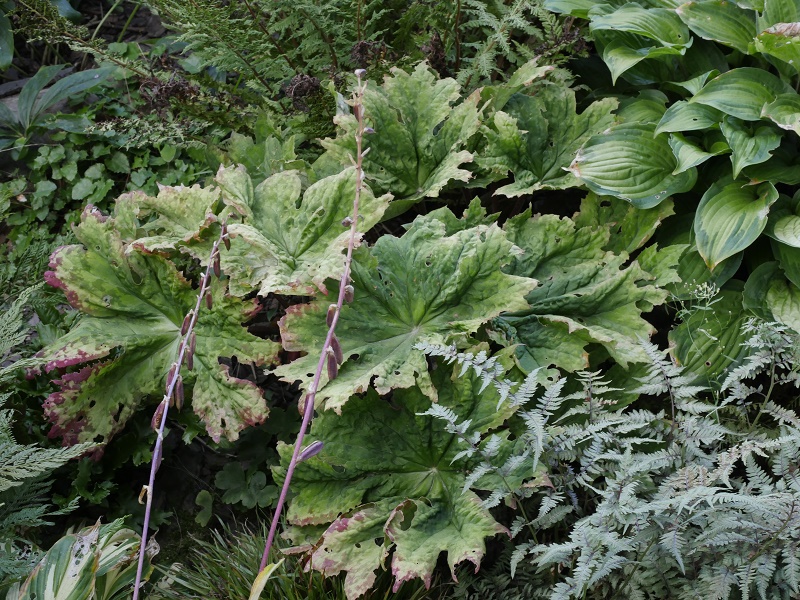 Podophyllum hemsleyi bardzo szybko startuje wiosną i co rok, pierwsze parasolki przemarzają. Dostał więc bardziej cieniste stanowisko niedaleko sosny.