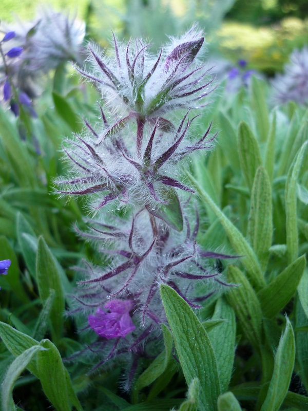 kwiatostan złożony z dwuwargowych, niebiesko-fioletowych kwiatów. Kielich kwiatowy jest brązowo-czerwony i pokryty długimi jasnymi, cieniutkimi włoskami. Kwitnie od końca maja do początków czerwca. W odpowiednich warunkach kwitnie prawie miesiąc.