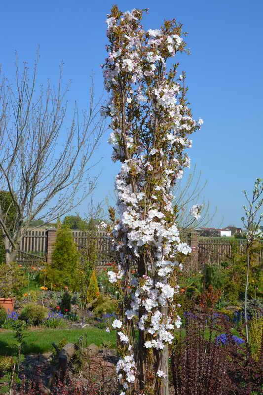 Wiśnia Amanogawa ładnie podrosła to jej czwarty sezon i pięknie zakwitła za to Kanzan wypuściła tylko listki i jednego kwiatka.