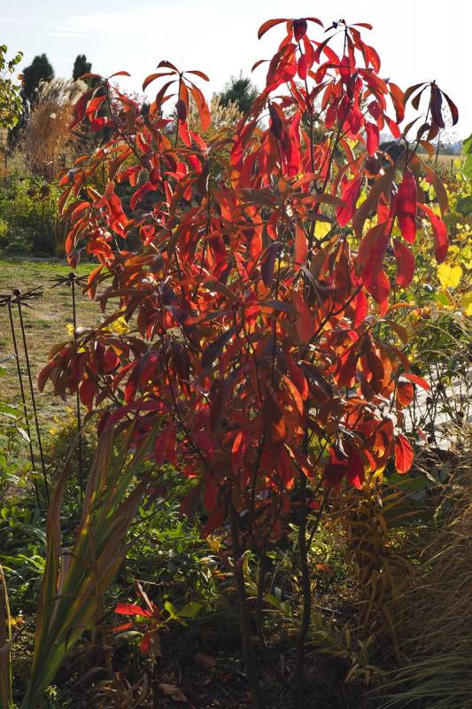Ulistnienie: liście dosyć duże (10-20cm), lancetowate, błyszczące, jesienią pięknie przebarwiają się na pomarańczowo- czerwono-purpurowe kolory.