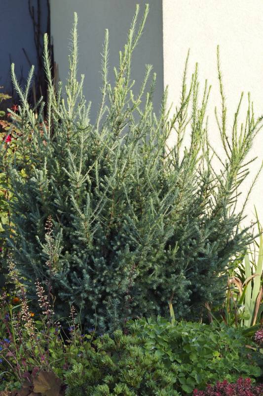 Stożkowy, wąski. Dorasta do 20 m wysokości. Rośnie dość powoli. Korona wąska, gałęzie krótkie, nieco zadarte do góry.