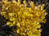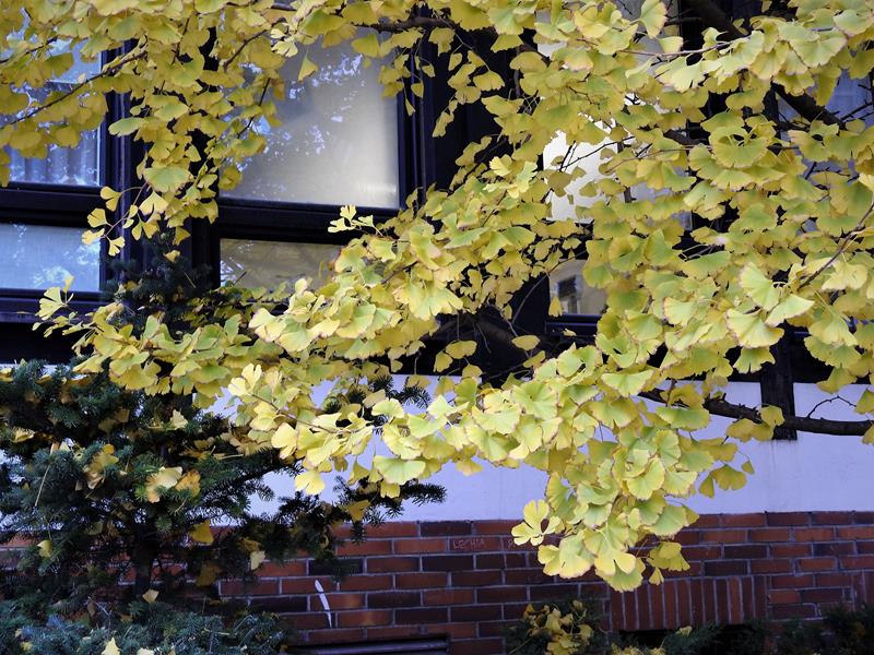 Liście: wachlarzowate, osadzone na długim ogonku, szerokości 5–8 cm., jasnozielone w nieregularne kremowe paski, jesienią przebarwiają się na żółto.
