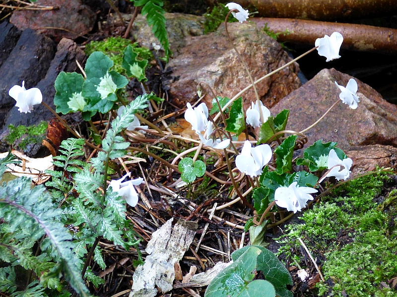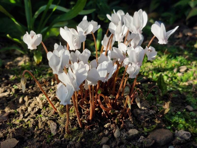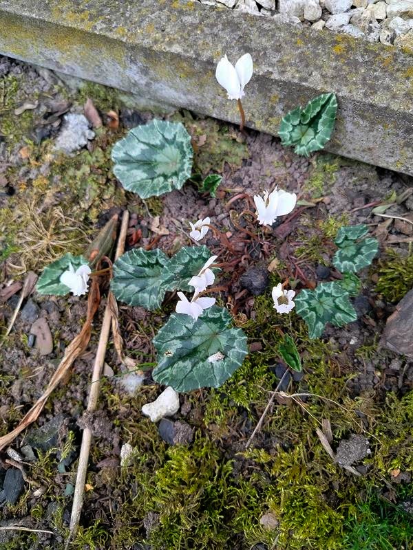 Cyclamen hederifolium 'Silver Leaf Alba' kwitnie dużo, dużo skromniej i dopiero niedawno zaczął produkować liście
