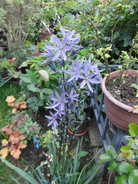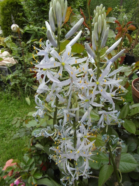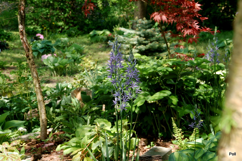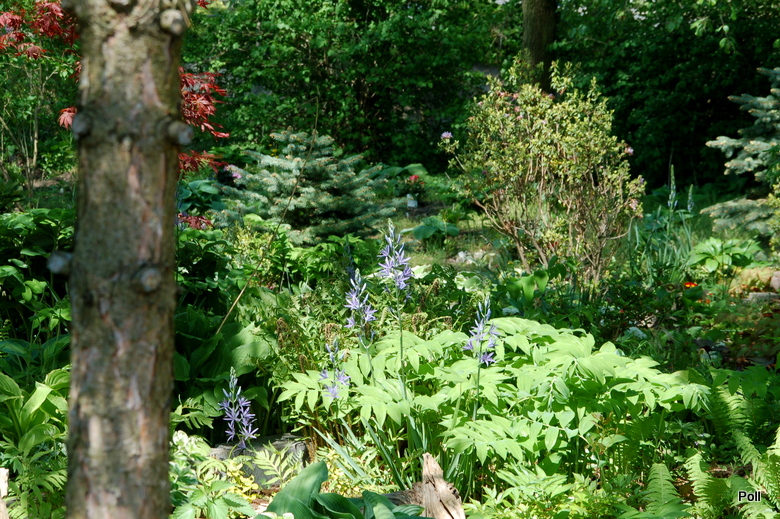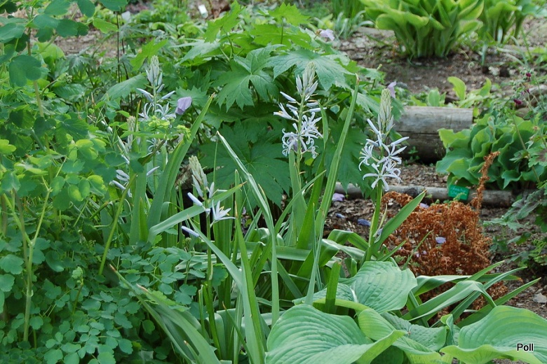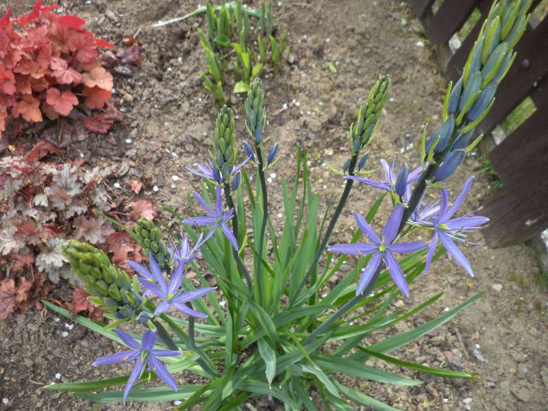 Nie znam nazwy mojej kamasji, ale wg.powyższych opisów wygląda na Blue Melody /chyba,że się mylę?/. Posadziłam kilka cebul jesienią 2014 obok hosty z zamysłem, że kiedy ta rozwinie swoje liście, kamasja już przekwitnie i schowana pod hostą ,spokojnie będzie sobie usychać i gromadzić zapasy w cebulach. Pomysł może był niegłupi, ale nie wzięłam pod uwagę tego, że hosta szybko się rozrośnie i moja kamasja znajdzie się w jej środku. Jesienią przesadziłam cebule kamasji na zupełnie inne stanowisko, bardziej słoneczne i gliniaste.