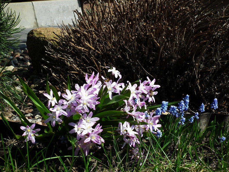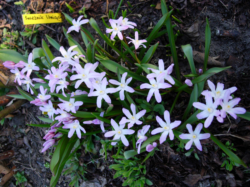 Śnieżnik Forbesa (Chionodoxa forbesii) Pink Giant jeszcze ładnie kwitnie bo rośnie w większym cieniu.