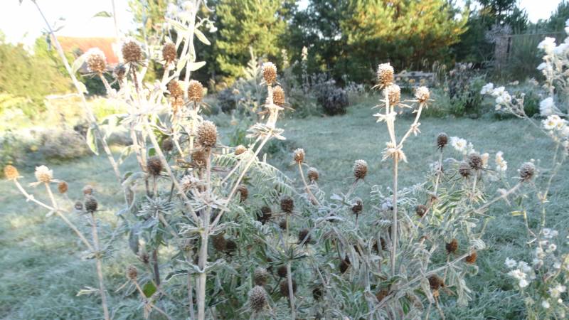 Gdy poranne słońce przebije się przez jesienną mgłę, ogród zamienia się w kryształowy pałac, gdzie rośliny mieniąc się w blasku przypominają oddech natury uwięziony w lodowych klejnotach. Oszronione gałązki, obwieszone lśniącymi kryształkami, zdają się pulsować światłem, a biel mgły oplata je jak delikatna zasłona, tworząc widowisko pełne magii i ciszy. Każdy liść staje się zwierciadłem, odbijającym promienie w tysiącu odcieni, jakby sam wiatr utkał z lodu koronę dla tej zimowej oazy.