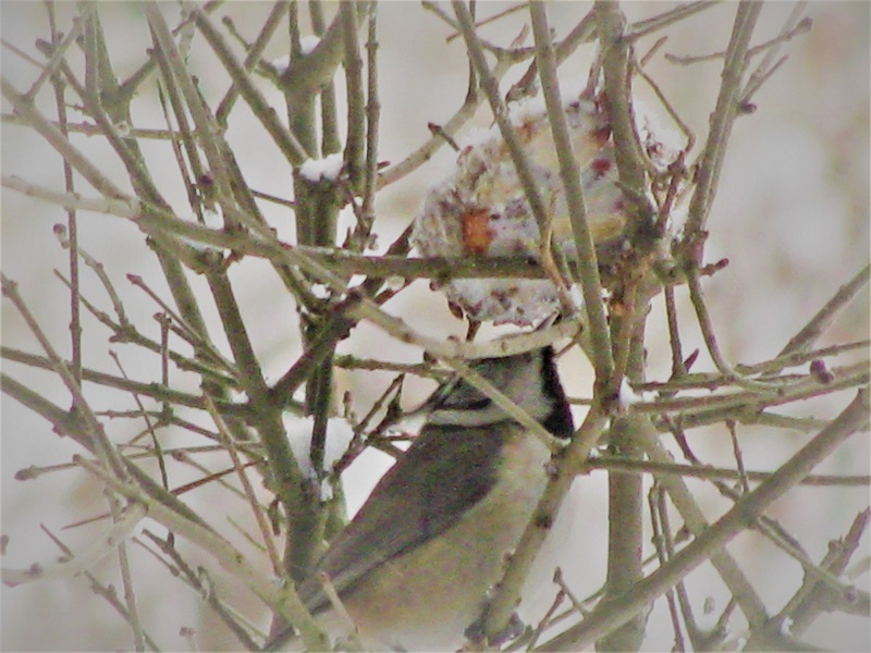 Chwilę posiedział , po czym sfrunął na ziemię i zaraz wrócił na gałąź. Cały nasz widok w oknie został przesłonięty przez fruwające piórka... jakby ktoś rozerwał pierzynę.
