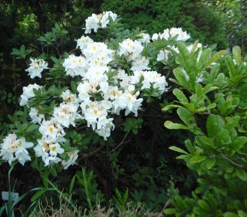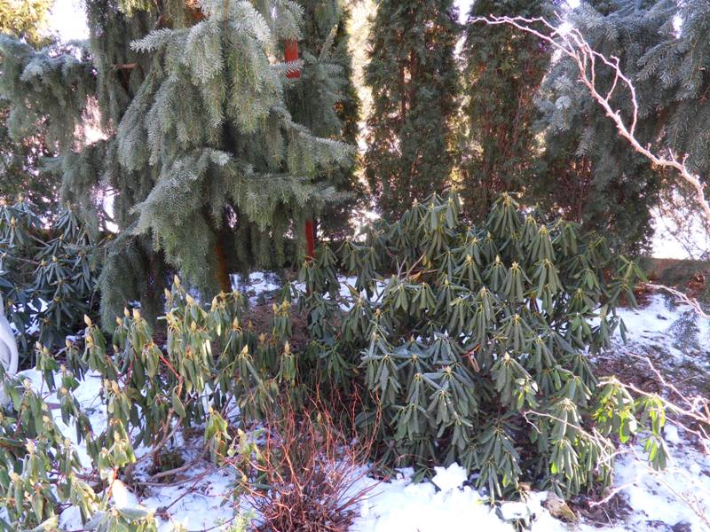 Rhododendron ludlowii albo któraś z jego odmian 'Wren' albo 'Curlew'... 'Wren dorasta po 10 latach do hen... 20 cm przy 40 cm szerokości...