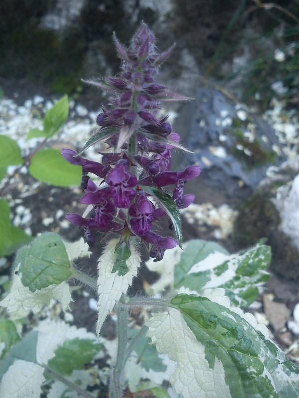 Kwiaty zebrane w okółki po 4-6 kwiatów oddalonych od siebie. Ciemnokarminowe lub czerwonofioletowe. Korona dwuwargowa; górna warga niepodzielna, dwukrotnie krótsza od dolnej. Dolna warga w białe wzorki, złożona z trzech zaokrąglonych klap. Kielich jest dzwonkowaty o ząbkach szydlastych i ogruczolony. Wewnątrz znajduje się dwudzielny słupek i 4 pręciki. Kwitnie od IV do IX.