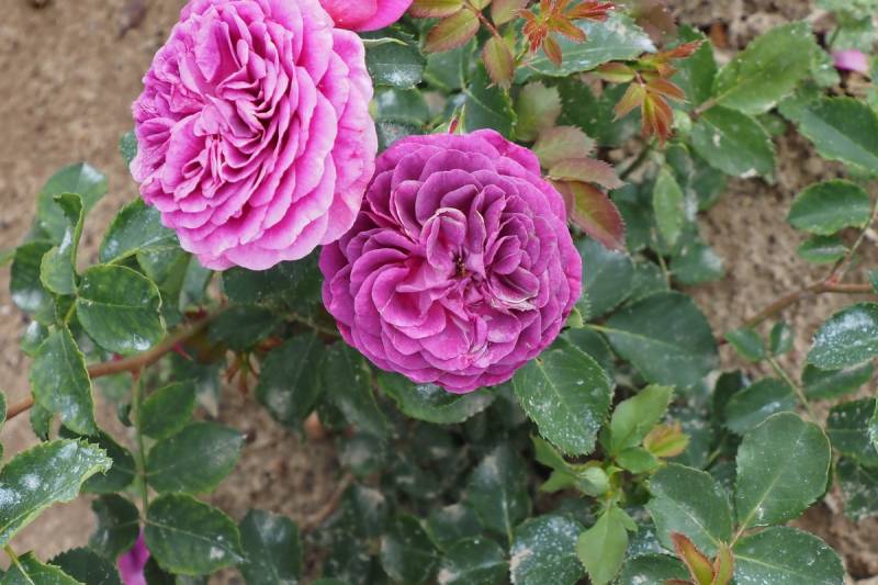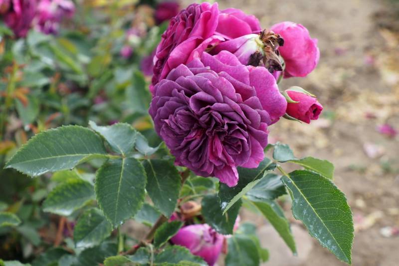 Kwiaty: pełne, ćwierćrozetowe, nawiązujące stylem do odmian historycznych, fioletowo purpurowe (Ø: 6-7 cm)