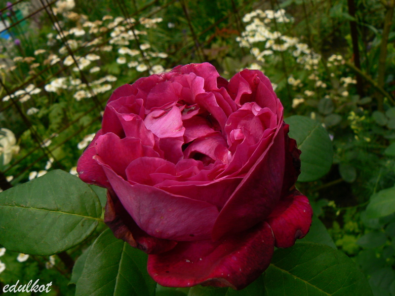 Kwiaty duży ok. 9 cm, ciemnoczerwony przechodzący czasami w purpurę. Pachnie. Kwitnie w czerwcu i powtarza kwitnienie.