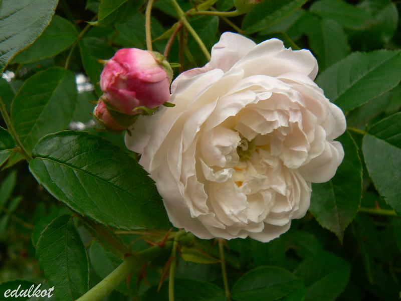Kwiaty: białe z odrobiną różu, małe o średnicy ok. 6 cm, podwójne (40 płatków), rozwijają się z czerwonych pączków, z tendencją do przewieszania, w niewielkich wiechach, w rozkwicie do płaskiej formy ukazują środek, kwitnie wczesnym latem.