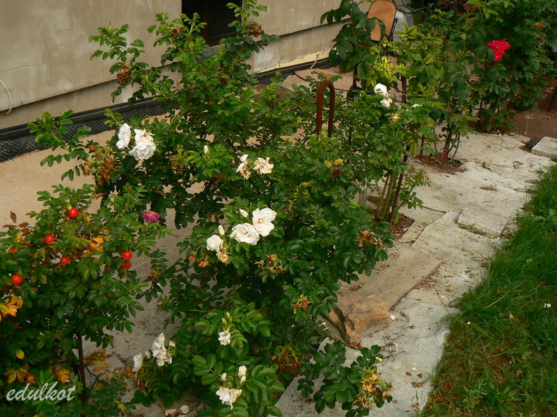 Do tych plusów muszę dodać jeden, ale wielki minus, wystarczy trochę deszczu, a pączki robią się brązowawe, do tego nie czyści się i jej uschnięte rude płatki wiszą potem na końcach pędów, trzeba je usuwać ręcznie, a nie jest to takie proste przy jej wielkości i obecności kolców wszędzie.