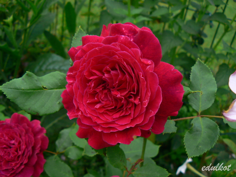 Kwiaty: ciemnoczerwone do purpurowych, ćwierć-rozetowe, duże średnicy 10 cm, pełne (ok. 50 płatkó), słabo powtarza,