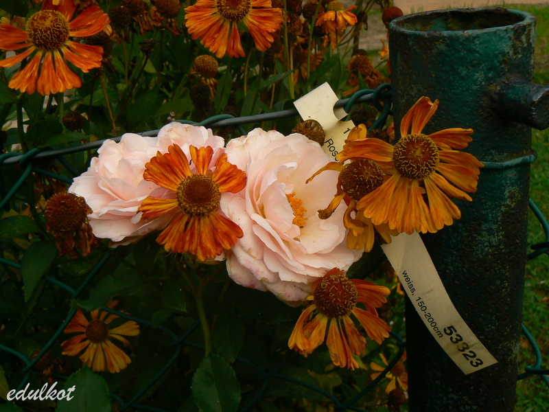 Dziękuję za te zdjęcia, widać, ze urosła, wysokość tak z 1,60m chyba. Wygląda zdrowo i uroczo. Edulkocie, chcę jeszcze Cię pomęczyć, jeśli pozwolisz, czy masz może zdjęcia jak przekwita? Eva Marie ma płaskie, miseczkowate kwiaty, bardzo regularne, eleganckie, z dużym, nieosłoniętym złotym środkiem, moja jest trochę inna. Kwiaty są wyższe, środek mniejszy, bardziej zasłonięty przez węższe płatki i szybko brązowiejący.