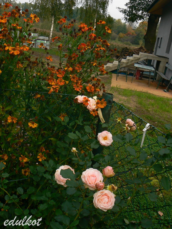 Dosadzona pomiędzy zasiedziałymi potworami czyli Madame Issak Pereire i Souvenir de Victor Landeau powolutku pnie się ku świetle, już nawet jesienią kwitła ponad siatką. Jak będzie miała tyle wigoru co matka to będzie walka o miejsce i cały ten róg ogrodzenia będzie okwiecony.