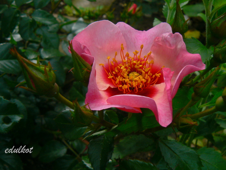Kwiaty: pojedyncze (4-8 płatków), średnie ok. 7 cm, różowe z ciemniejszym oczkiem charakterystycznym dla róż perskich, rozkwitając pokazuje bardzo ładny zestaw pręcików, kwitnie przez cały sezon,
