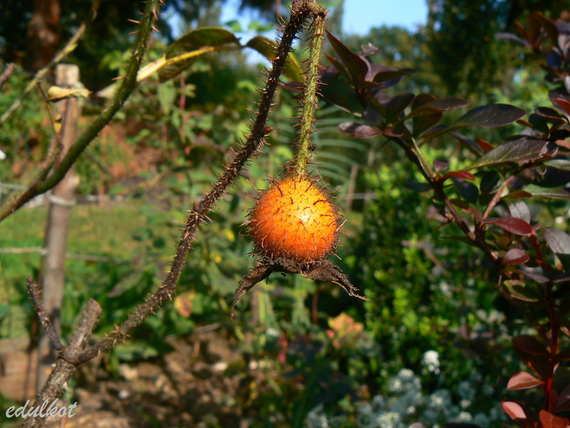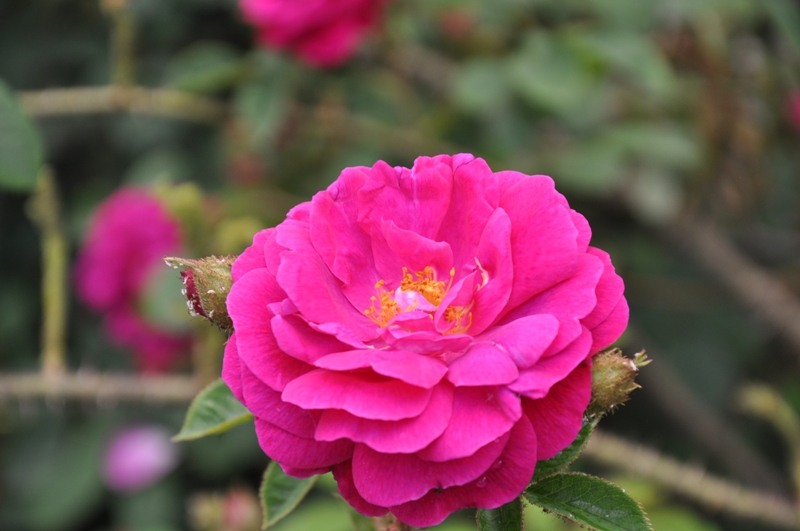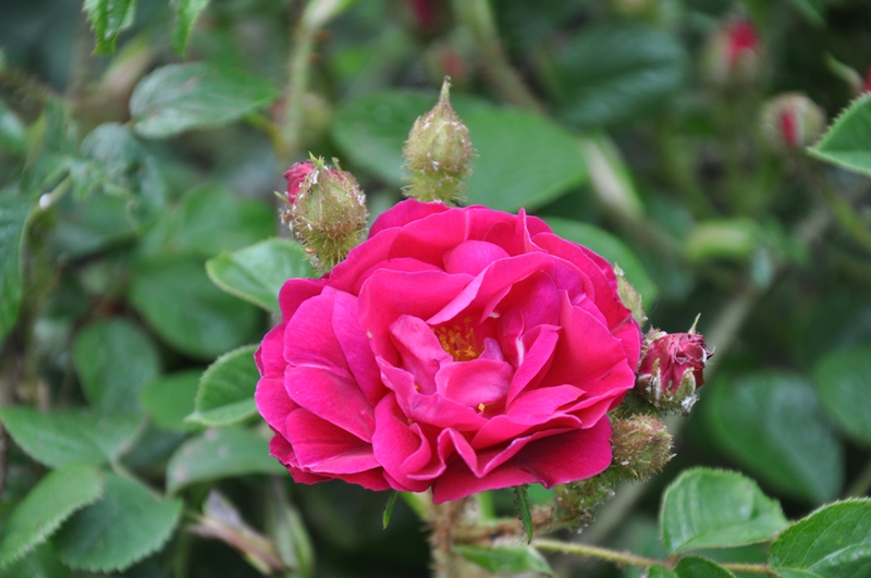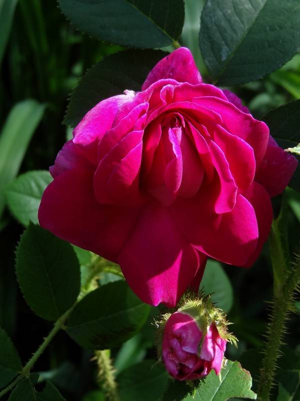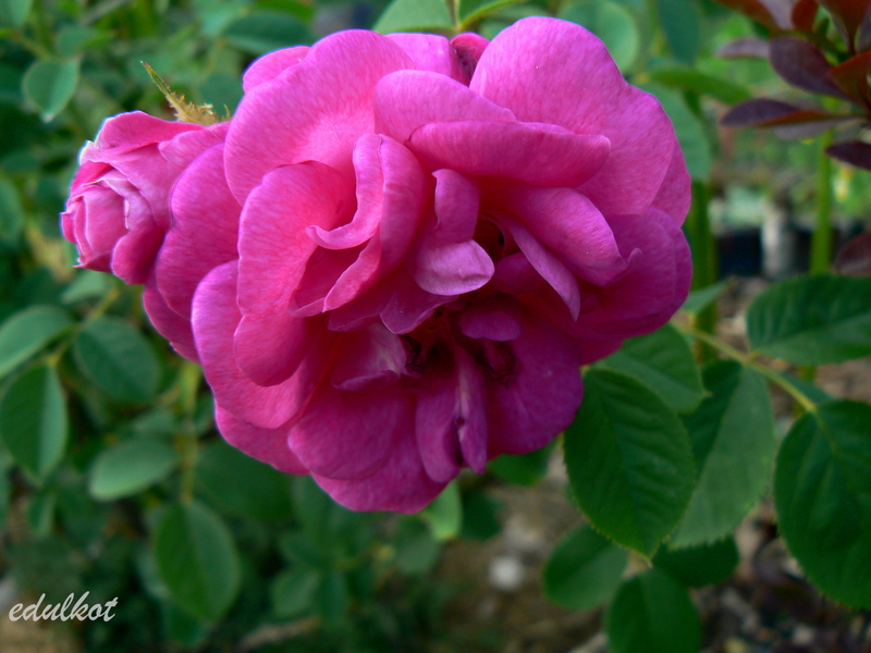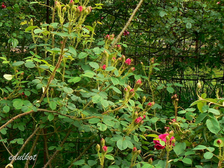 Kwiaty: średnie ok. 6-7,5 cm, półpełne, ciemno różowe poprzez liliowe do czerwonych, w rozkwicie pokazuje żółte pręciki, pąki okryte zielonym mchem, kwitnie raz choć podobno czasami powtarza, zawiązuje owoce,