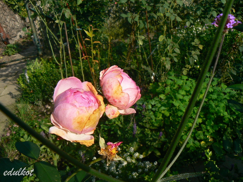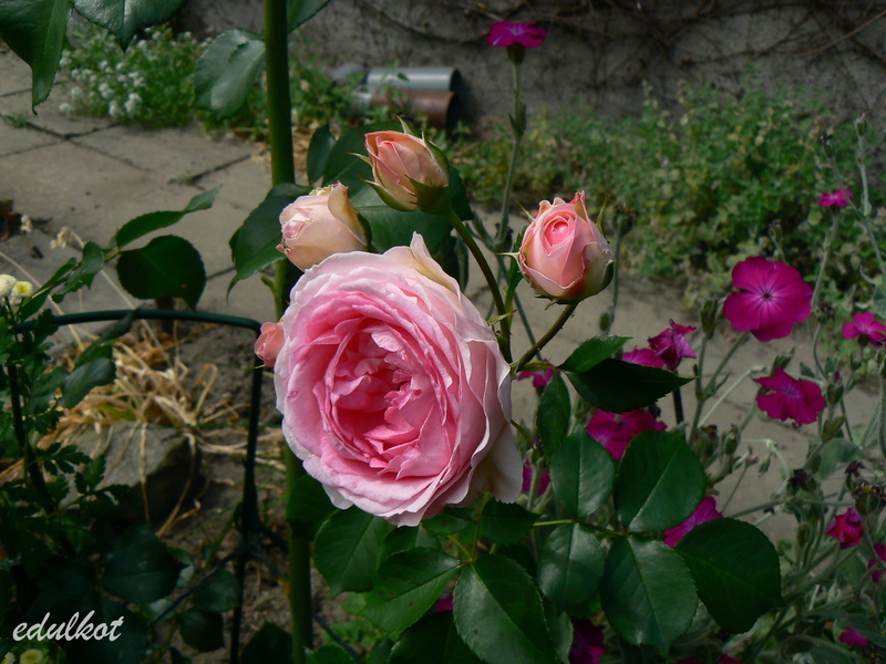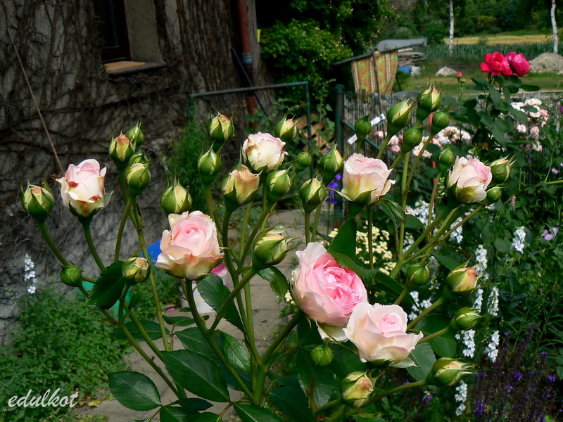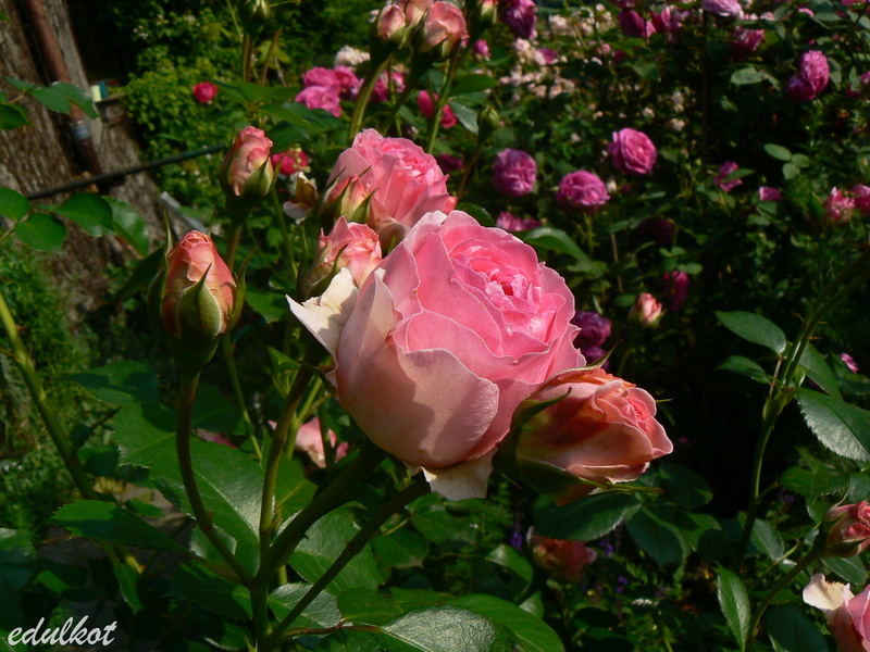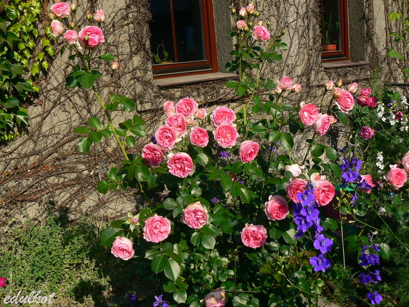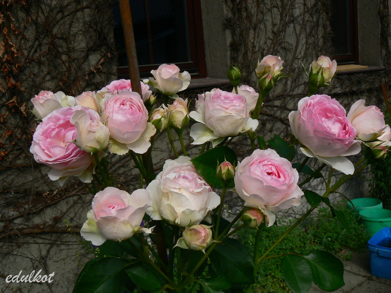 Kwiaty: różowe do jasnoróżowych, średnie, pełne (ponad 40 płatków), kwitnie bukietami cały sezon,