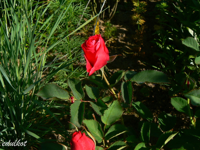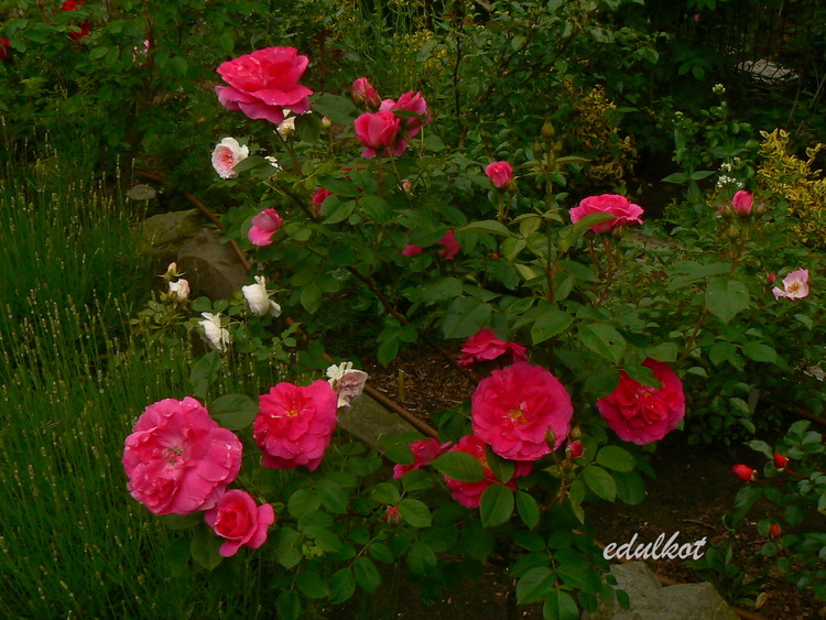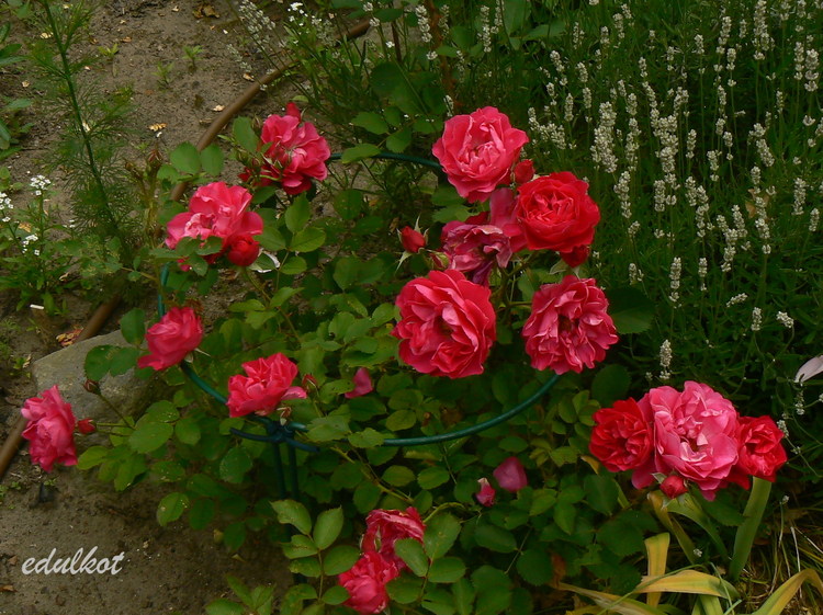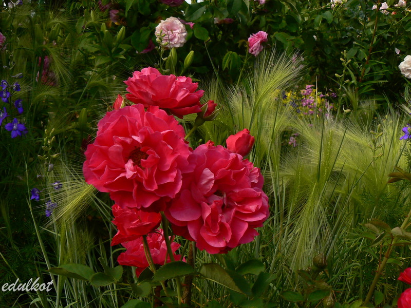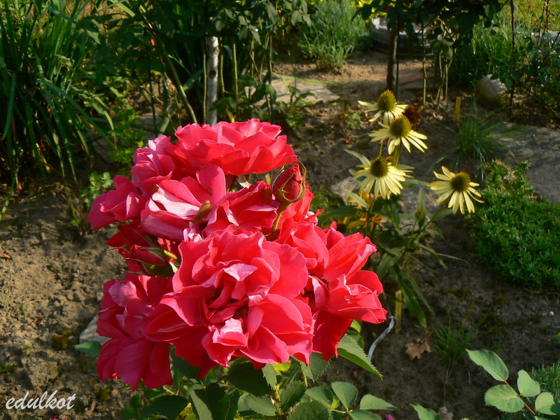 Kwiaty: karminowo-różowe, średnie ok. 6-7 cm, pojedyncze i półpełne (16-25 płatków), kwitnie bukiecikami całe lato, sporadycznie powtarza,