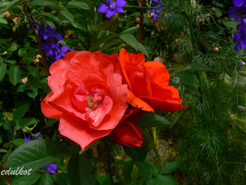 Kwiaty: pomarańczowo-czerwone do czerwonych, średnie ok. 5-6 cm, półpełne (20-25 płatków), miseczkowate, kwitnienie małymi bukiecikami cały sezon, najsłabiej kwitnąca z całej serii zwłaszcza w drugiej części sezonu, związuje duże owoce,