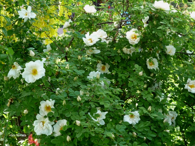 Nevada piękna o dużych białych kwiatach z żółtymi pręcikami cały krzew obsypany bielą wygląda bajecznie .