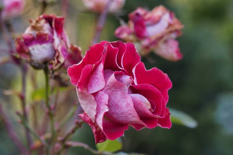 Kwiaty: Drobne średnicy 4-5 cm, pełne czerwono-białe zebrane po kilkanaście w kwiatostanie.