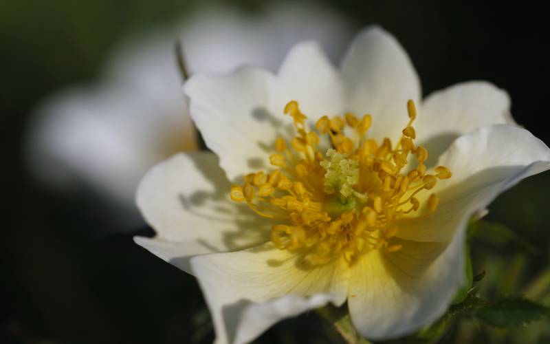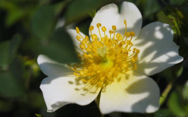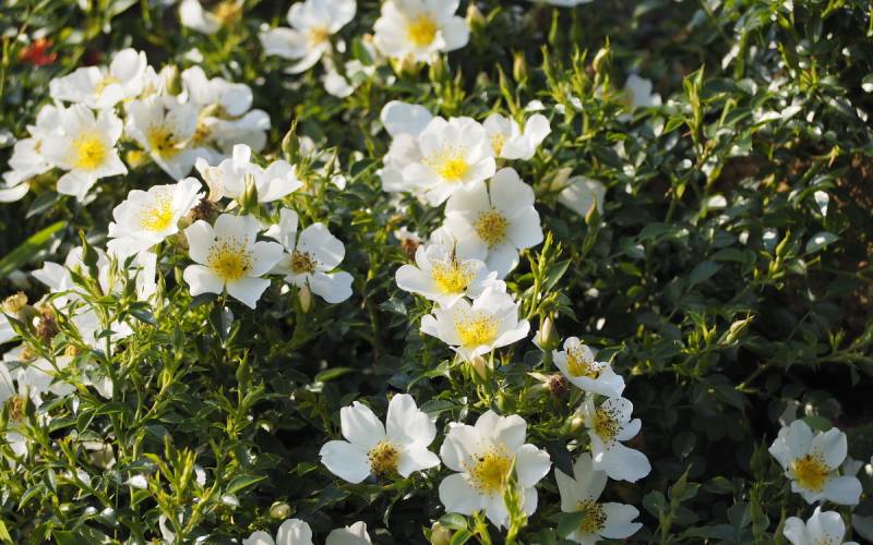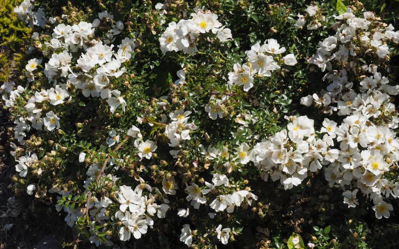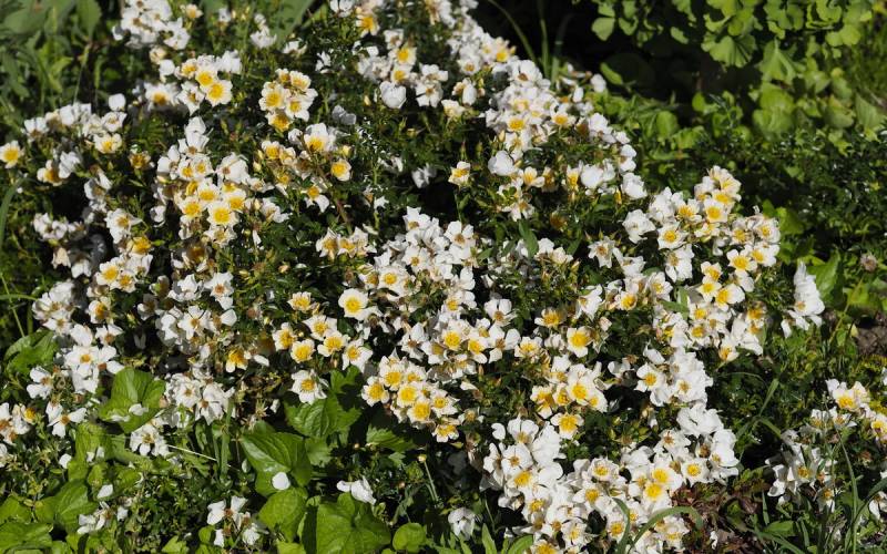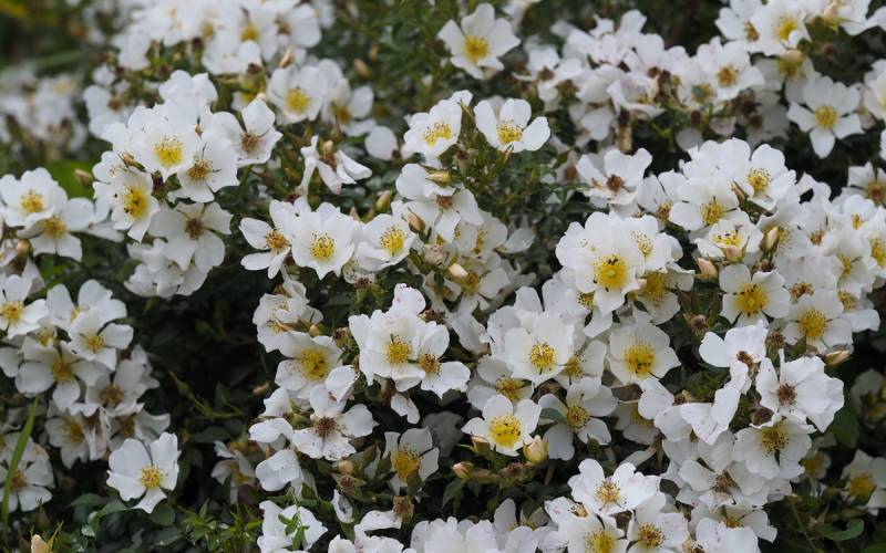Kwiaty: małe 3 cm, pięciopłatkowe, białe, żółte pręciki, kwitnie bukiecikami cały sezon;