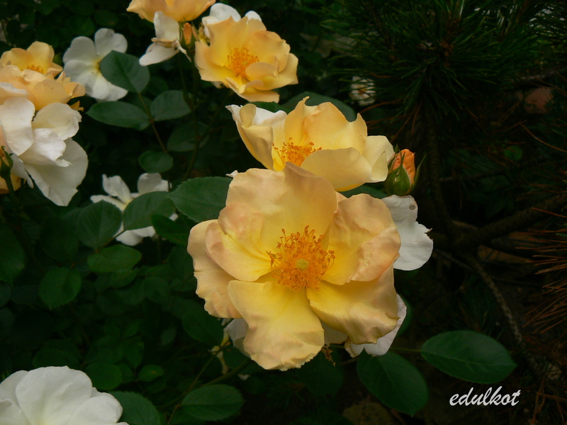 Kwiaty: średnie, pojedyncze, żółte do blado-żółtych, łososiowe zacienienia, ozdobne pręciki, kwitnie wiechami cały sezon;