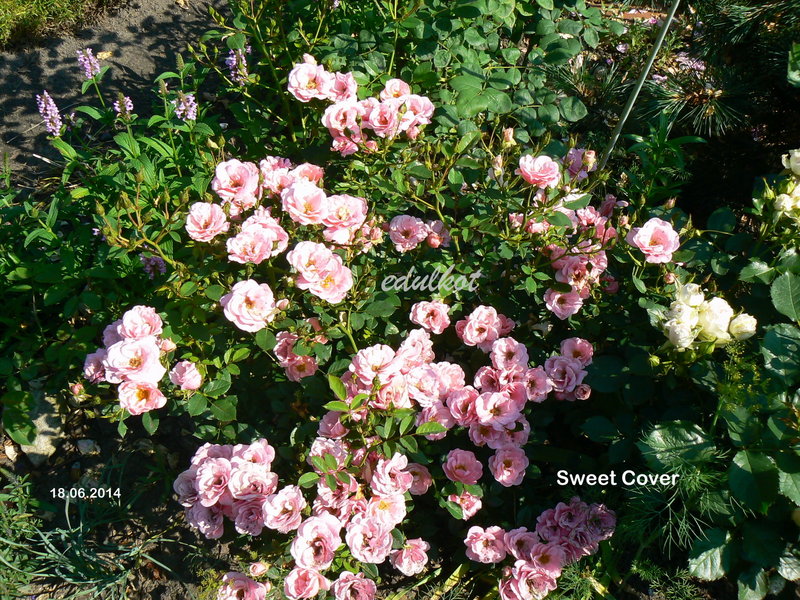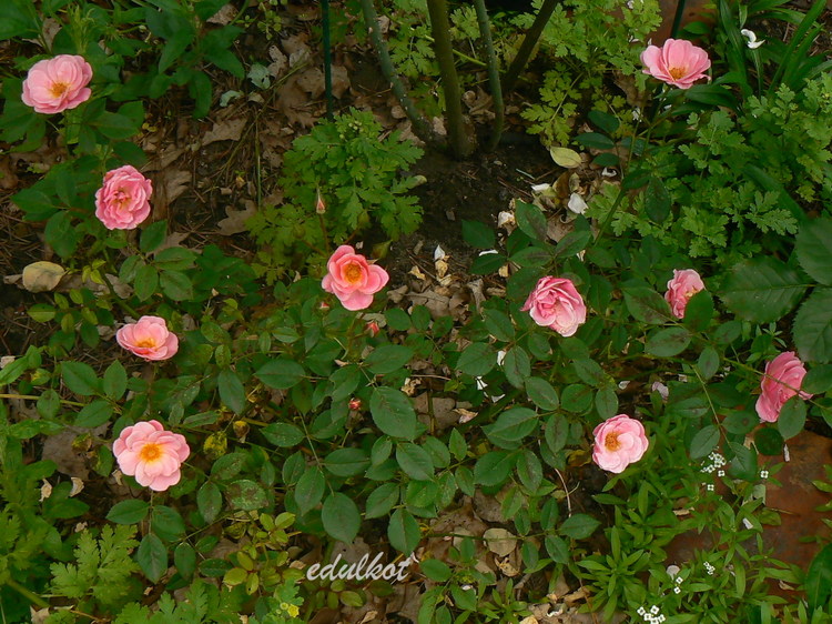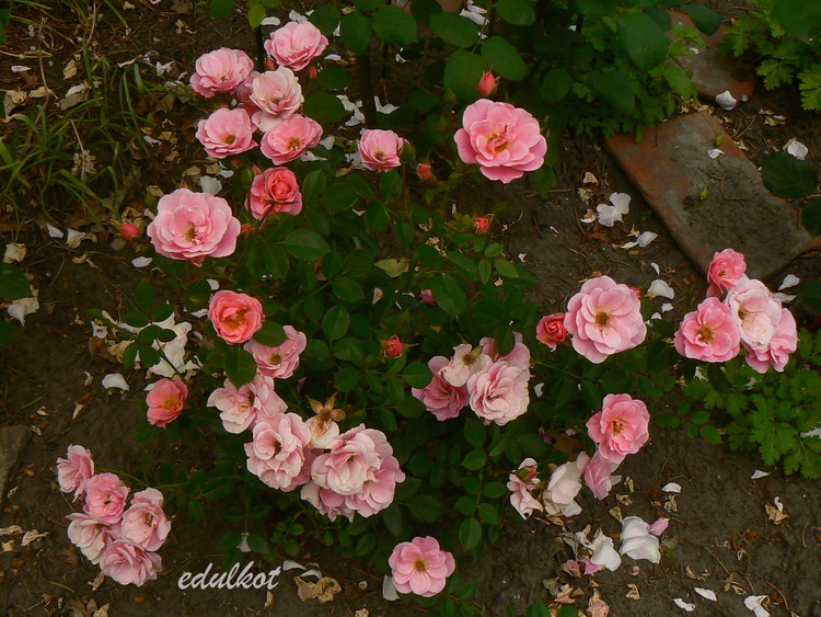 Kwiaty: małe 3-4 cm, półpełne (9-16 płatków), różowe, kwitnie cały sezon, kwiaty same odpadają po przekwitnięciu;