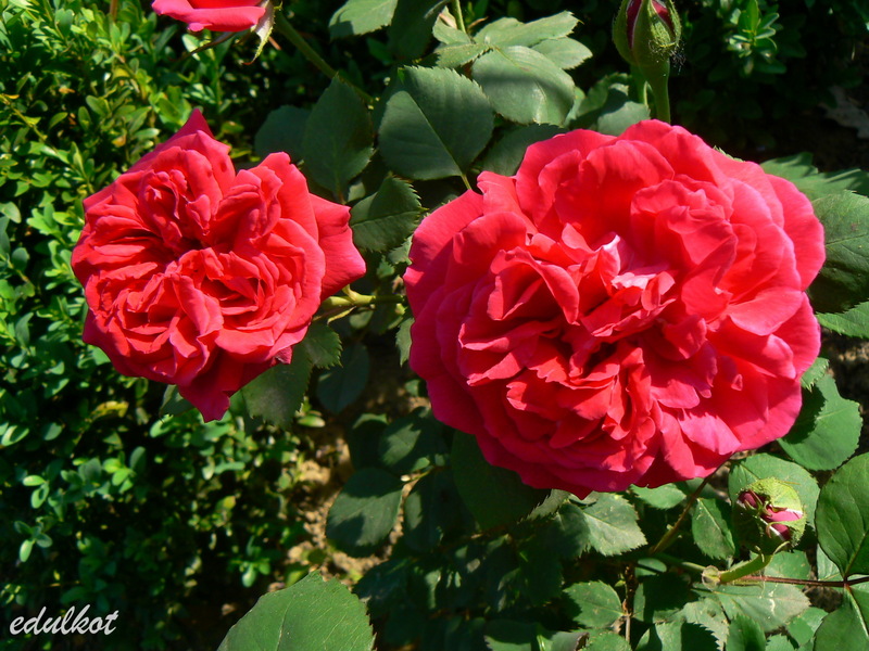 Kwiaty: duże 9 cm, pełne (26-40 płatków), rozetowe, czerwone, powtarza;