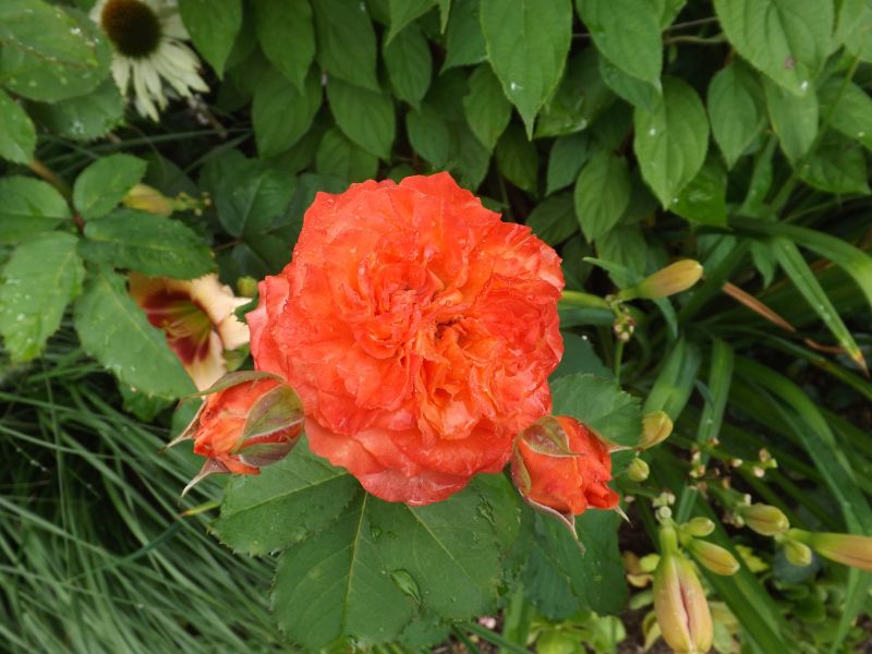 Kwiaty przepiękne duże w kolorze pomarańczy i jaskrawej czerwieni. Okajonalnie powtarza kwitnienie. Pachnie.