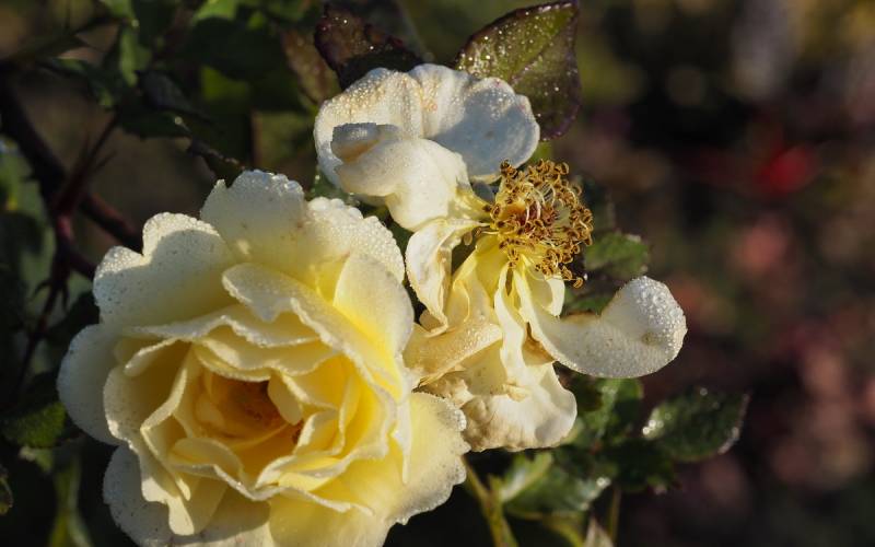 Kwiaty: jasnożółte, fantazyjne pofalowane ( Ø: 8-9 cm ) półpełne z widocznym brązowym środkiem i ładnymi pręcikami. Ściągają do ogrodu mnóstwo pszczół, a jesienią dodatkowym atutem jest wysyp atrakcyjnych owoców.