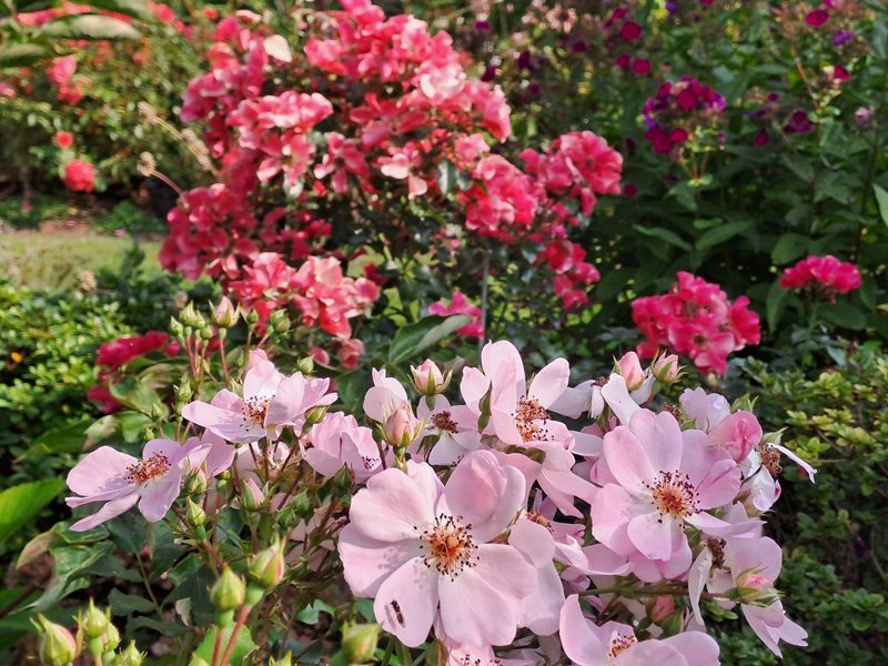 Kwiaty: jasnoróżowo-liliowe, pojedyncze ze ślicznym wachlarzem pomarańczowo-czerwonych pręcików ( Ø: 4-6 cm ); kwitnie niestrudzenie przez cały sezon, sama czyści się z niechcianych płatków