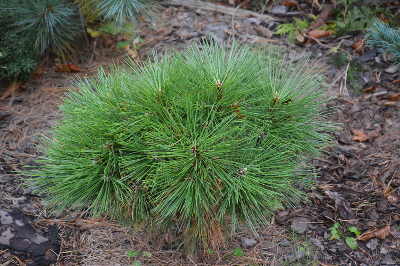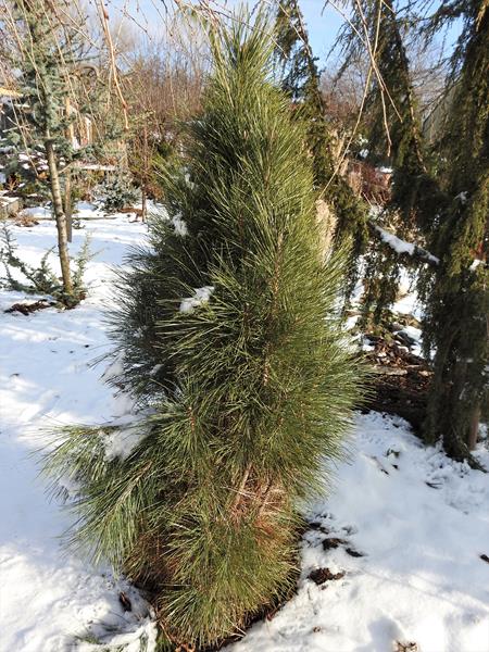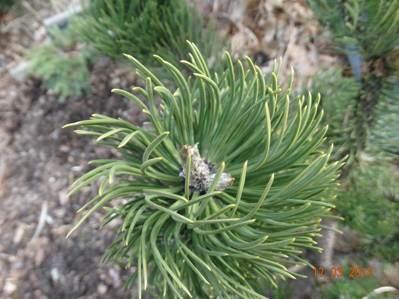 Igły: długie (10-12 cm), ciemnozielone, błyszczące, bardzo gęsto ułożone, zebrane po dwie
