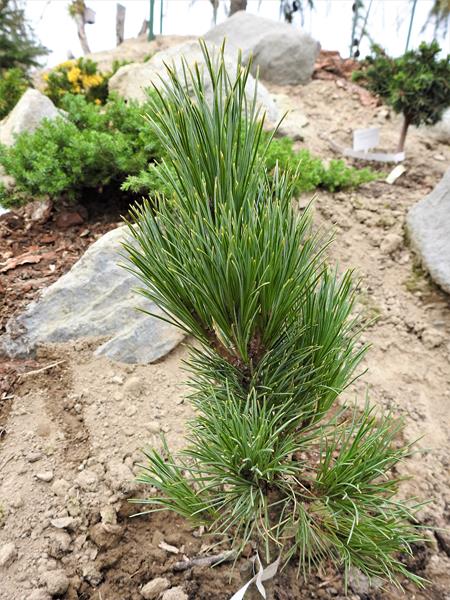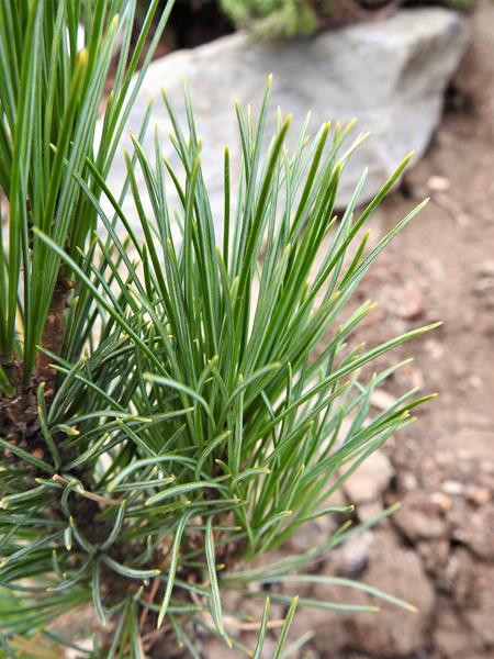 Sztywne, żywozielone i ostro zakończone igły zebrane są w pęczki po 5 na krótkopędach. Osiągają 7–9 cm długości i 1 mm szerokości, na przekroju są trójkątne, na brzegach delikatnie ząbkowane. Pochewki liściowe szybko opadają.