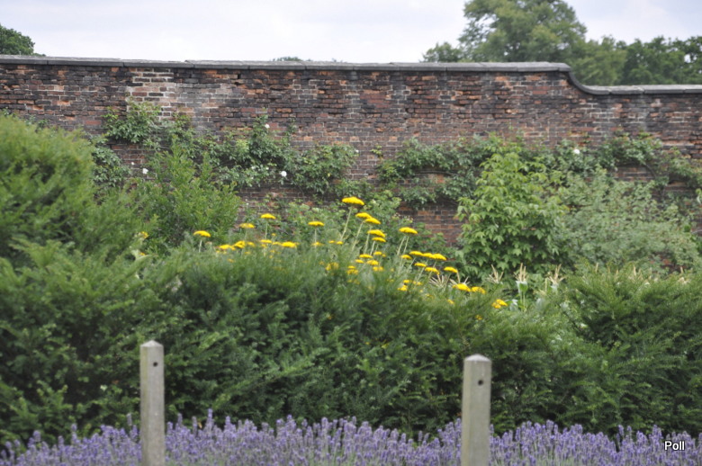 [1] Angielski ogród kuchenny otoczony murem z rabatami ozdobnymi oraz ziołowymi przy pałacu na Warmii, Polska.