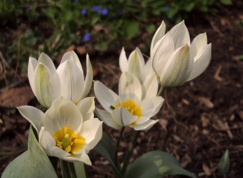 Tulipa polychroma na tapecie. Gatunek pochodzi z Iranu i Afganistanu, ale spokojnie - rośnie tam na takich wysokościach i w takich warunkach że spokojnie daje radę w naszym klimacie. Pierwszy raz został opisany w 1885 roku przez botanika Otto Stapfa. Kwitnie bardzo wcześnie, niemal zaraz po tulipanach turkiestańskich. Malutki, na maksa 15 cm wysokości w porywach, ale kiedy rozwinie kwiaty jest niezwykle widowiskowy (no tak, bezczelnie przyznaję że dokupiłam w tym roku cebulki tego gatunku). Tych kwiatów na pędzie ma zazwyczaj od trzech do pięciu, ponoć to go odróżnia od