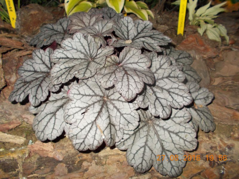 Rodzaj: Żurawka (Heuchera) Odmiana: Plum Royale Wymiary : odmiana tworząca kępy o szerokości 40 cm i wysokości 30 cm/70 cm z kwiatostanem. Kolorystyka: młode liście w kolorze śliwkowym z lekkim, metalicznymi przebłyskami, starsze z przewagą srebra. Kwiaty: białe. Kwitnienie: od maja do lipca. Warunki: stanowisko pół-cieniste/słoneczne.