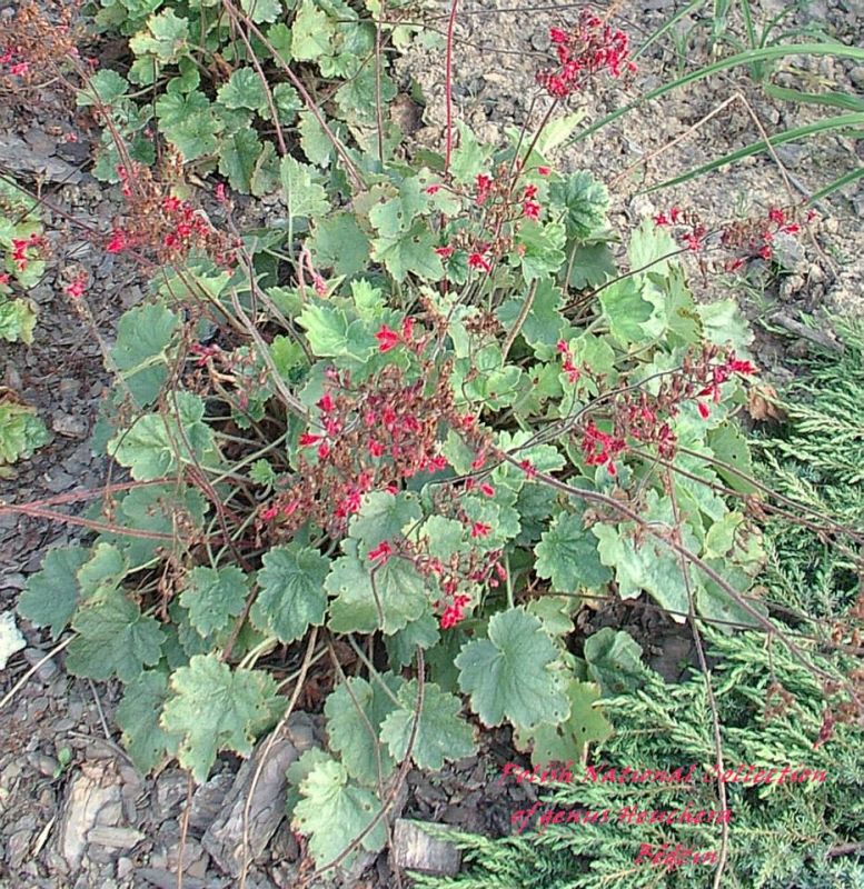 Rodzaj: Żurawka (Heuchera) Odmiana: Ruby Bells Wymiary: tworzy kępy o średnicy 30 cm i wysokości 15 cm/45 cm z kwiatostanem. Kolorystyka: liście zielone. Kwiaty: czerwone. Kwitnienie: od maja do końca sierpnia. Warunki: stanowisko pół-cieniste/słoneczne.