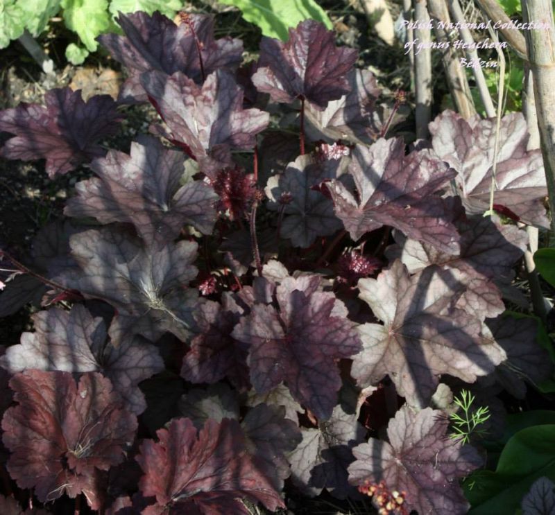 Rodzaj: Żurawka (Heuchera) Odmiana: 'Rose Mirrors' Wymiary: tworzy kępy o średnicy 35 cm i wysokości 15-20 cm/55 cm z kwiatostanem. Kolorystyka: liście w kolorach fioletowo-czerwonym, zielonym z fioletowymi przebarwieniami. Kwiaty:różowe. Kwitnienie: od końca maja do połowy sierpnia. Warunki: stanowisko pół-cieniste/słoneczne, żyzne, stale wilgotne