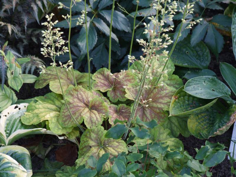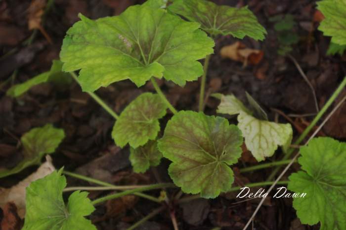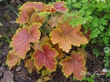 Rodzaj: Żurawka (Heuchera) Odmiana: Delta Dawn Wymiary: tworzy kępy o średnicy 30 cm i wysokości 20 cm/35 cm z kwiatostanem. Kolorystyka: czerwone liście z zielono- żółtą obwódką . Kwiaty: białe. Kwitnienie: od czerwca do sieprnia. Warunki: stanowisko pół-cieniste.
