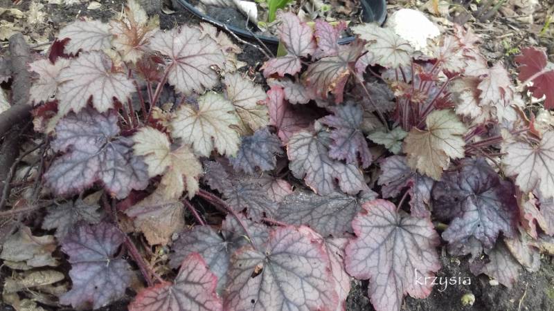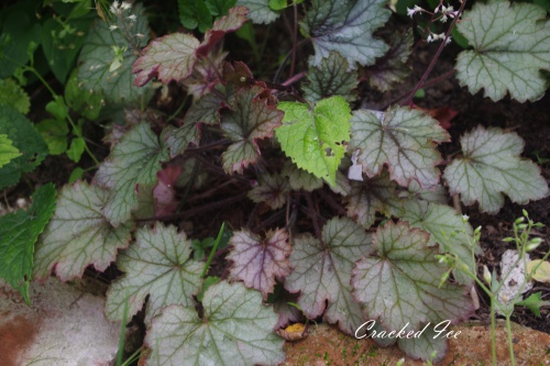 Rodzaj: Żuraweczka (Heucherella) Odmiana: Cracked Ice Wymiary : odmiana tworząca kępy o szerokości 40 cm i wysokości 15-20 cm/ 25 cm z kwiatostanem. Kolorystyka: liście srebrno-zielone z fioletowym marginesem i ciemnym żyłkowaniem . Kwiaty: białe. Kwitnienie: od czerwca do lipca. Warunki: stanowisko pół-cieniste/cieniste.