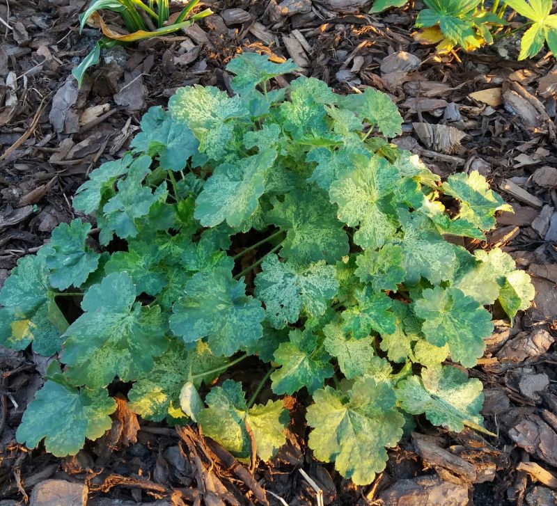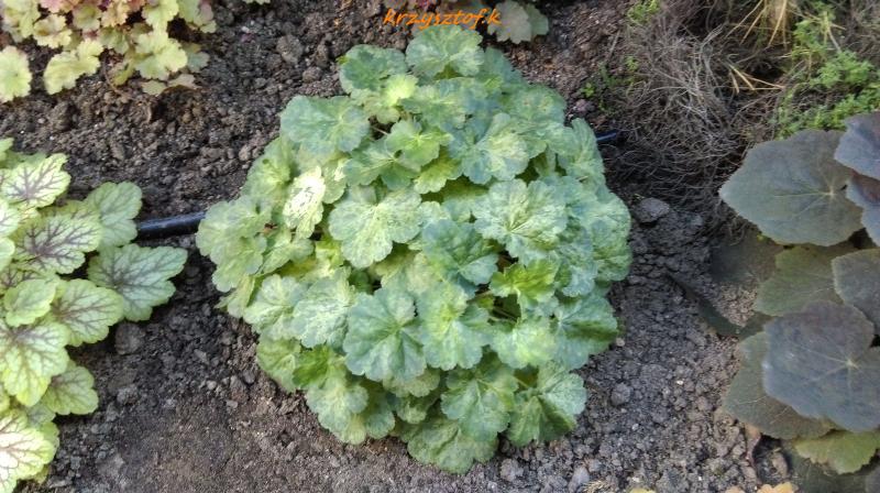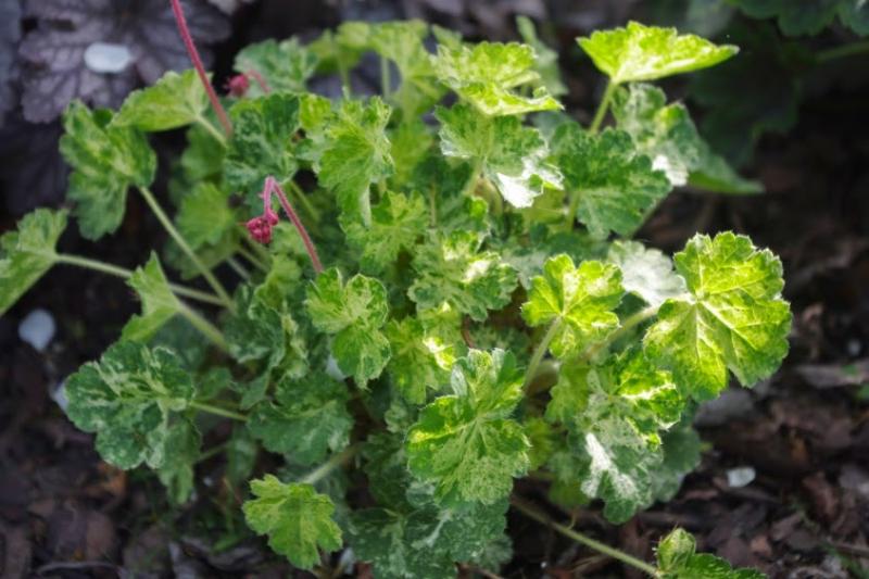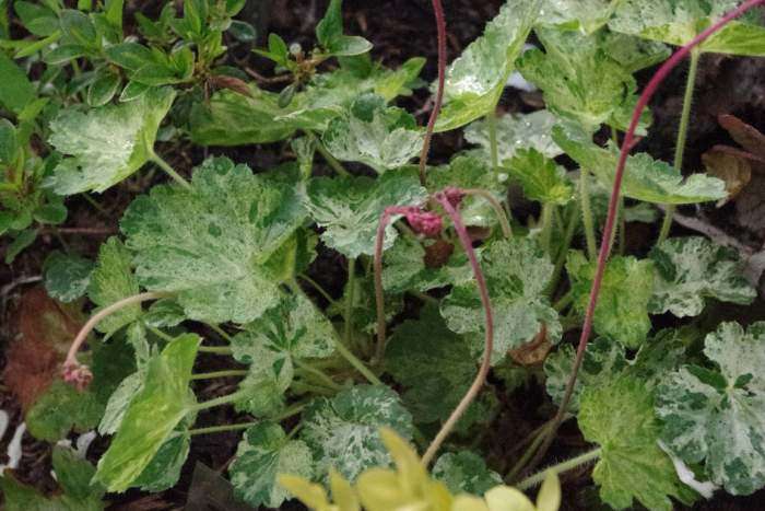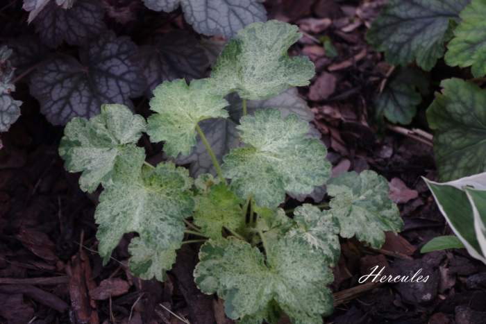 Rodzaj: Żurawka (Heuchera) Odmiana: Hercules Wymiary : odmiana tworząca kępy o szerokości 40 cm i wysokości 30 cm. Kolorystyka: ubarwienie mozaikowe typu variegata . Kwiaty: czerwone. Kwitnienie: od czerwca do lipca. Warunki: stanowisko pół-cieniste/słoneczne.