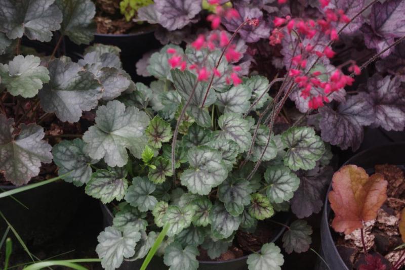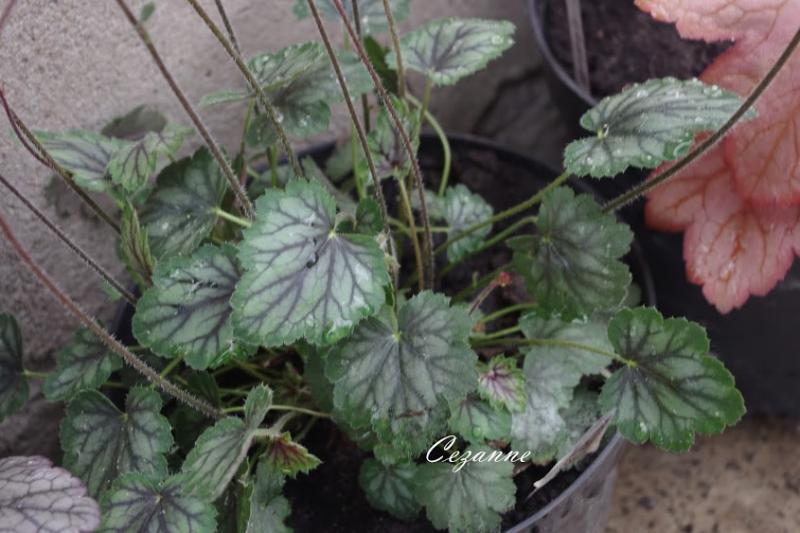 Rodzaj: Żurawka (Heuchera) Odmiana: Cezanne Wymiary : odmiana tworząca niewielkie kępy o szerokości 20 cm i wysokości 20 cm. Kolorystyka: liście srebrno-szare z zieloną obwódką. Kwiaty: czerwone. Kwitnienie: na początku lipca do września. Warunki: stanowisko pół-cieniste/słoneczne. Wrzesień, stanowisko: półcień