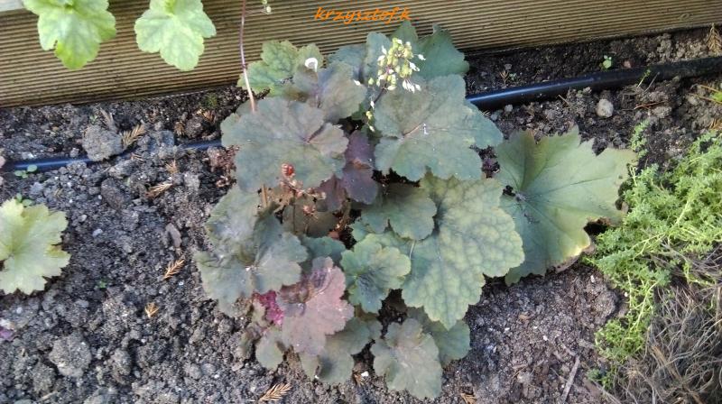 Rodzaj: Żurawka (Heuchera) Odmiana: Jerzy (Jerzy Foszczka) Wymiary : odmiana tworząca kępy o szerokości 40 cm i wysokości 25 cm. Kolorystyka: liście bordowo-brązowe, w cieniu odcienie zieleni. Kwiaty: kremowe. Kwitnienie: od lipca do września. Warunki: stanowisko pół-cieniste/słoneczne.
