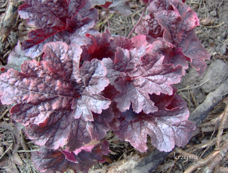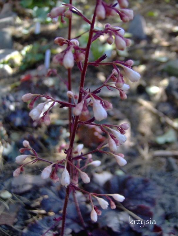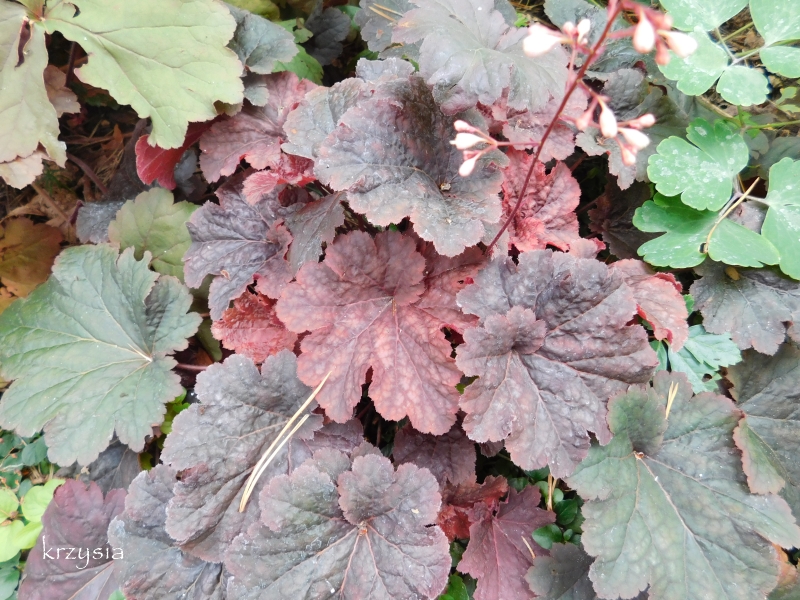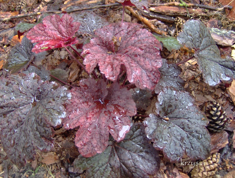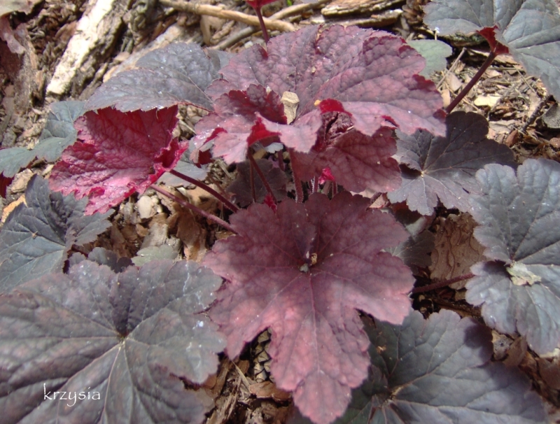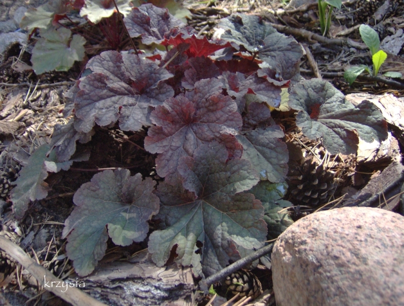 Rodzaj:Żurawka (Heuchera) Odmiana:'Cajun Fire' Wymiary : średnia odmiana tworząca kępy o szerokości 35 cm i wysokości 25 cm. Kolorystyka:białe kwiaty, liście wiosną przybierają czerwone odcienie, latem ciemnieją, a jesienią przebarwiają się na kasztanowo. Warunki: stanowisko pół-cieniste/słoneczne. Kwitnienie: maj/czerwiec.
