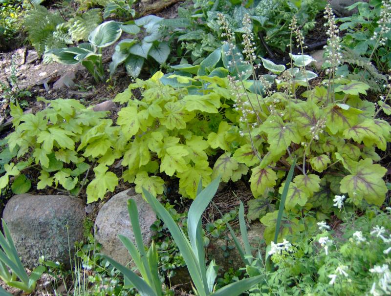 Rodzaj: Żuraweczka (Heucherella) Nazwa: Stoplight Wysokość: ok 40 cm wg doniesień internetowych przy podobnej szerokości. Kolorystyka: liści to żółto zielony z brązowo czerwonym zabarwieniem nerwów, jesienią znacznie wyraźniejsze niż latem. Wymagania: toleruje nieco słońca - u mnie ma słońce od świtu do godz ok 11, potem ma cień do godz 17-18.