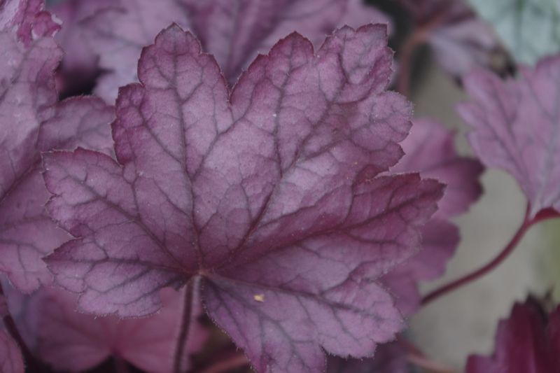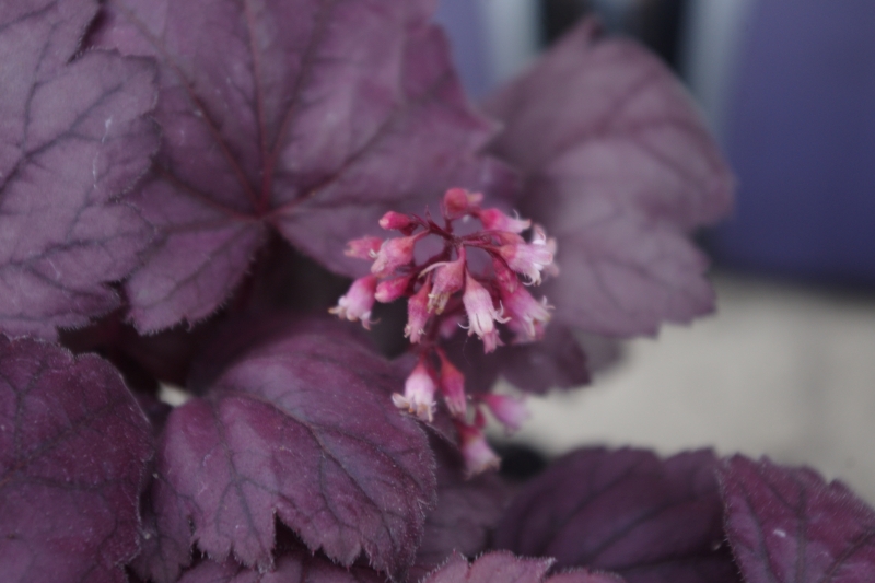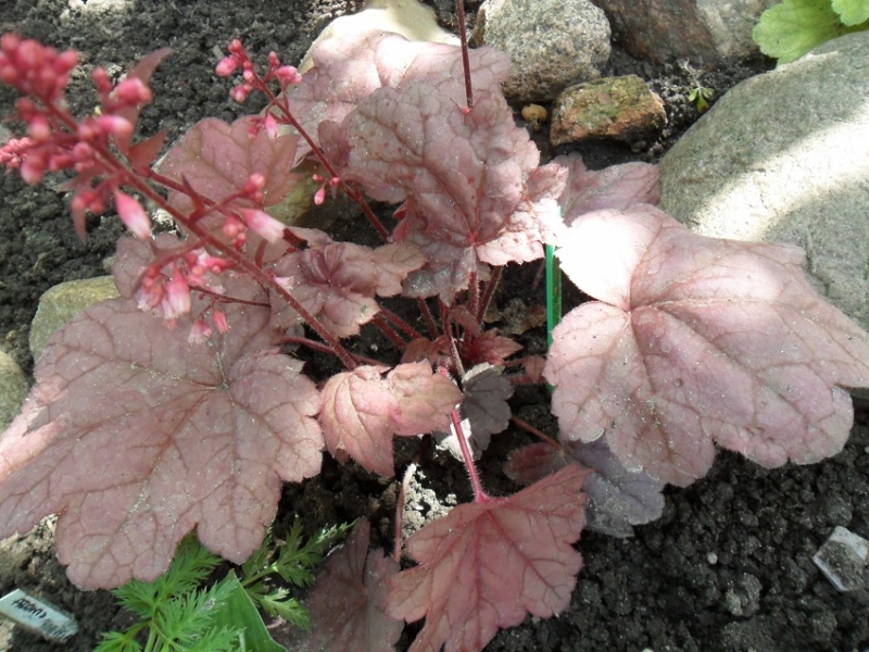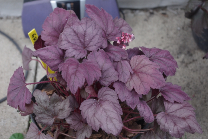 Rodzaj:Żurawka (Heuchera) Odmiana:'Grape Soda' Wymiary : odmiana tworząca kępy o szerokości 40 cm i wysokości 25 cm. Kolorystyka:kremowe kwiaty, różowofioletowe liście . Warunki: stanowisko pół-cieniste/cieniste , gleba żyzna, stale wilgotna. Kwitnienie: od kwietnia do sierpnia.