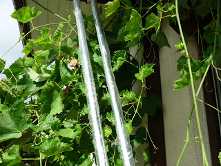 Rurki prowadzące przymocujemy do pergoli za pomocą blaszek. Dzięki temu cała konstrukcja łatwo zostanie rozmontowana na zimę. Boczne rurki są poniżej górnej belki pergoli. Środkowa rurka umocowana jest wyżej, aby uzyskać spad .